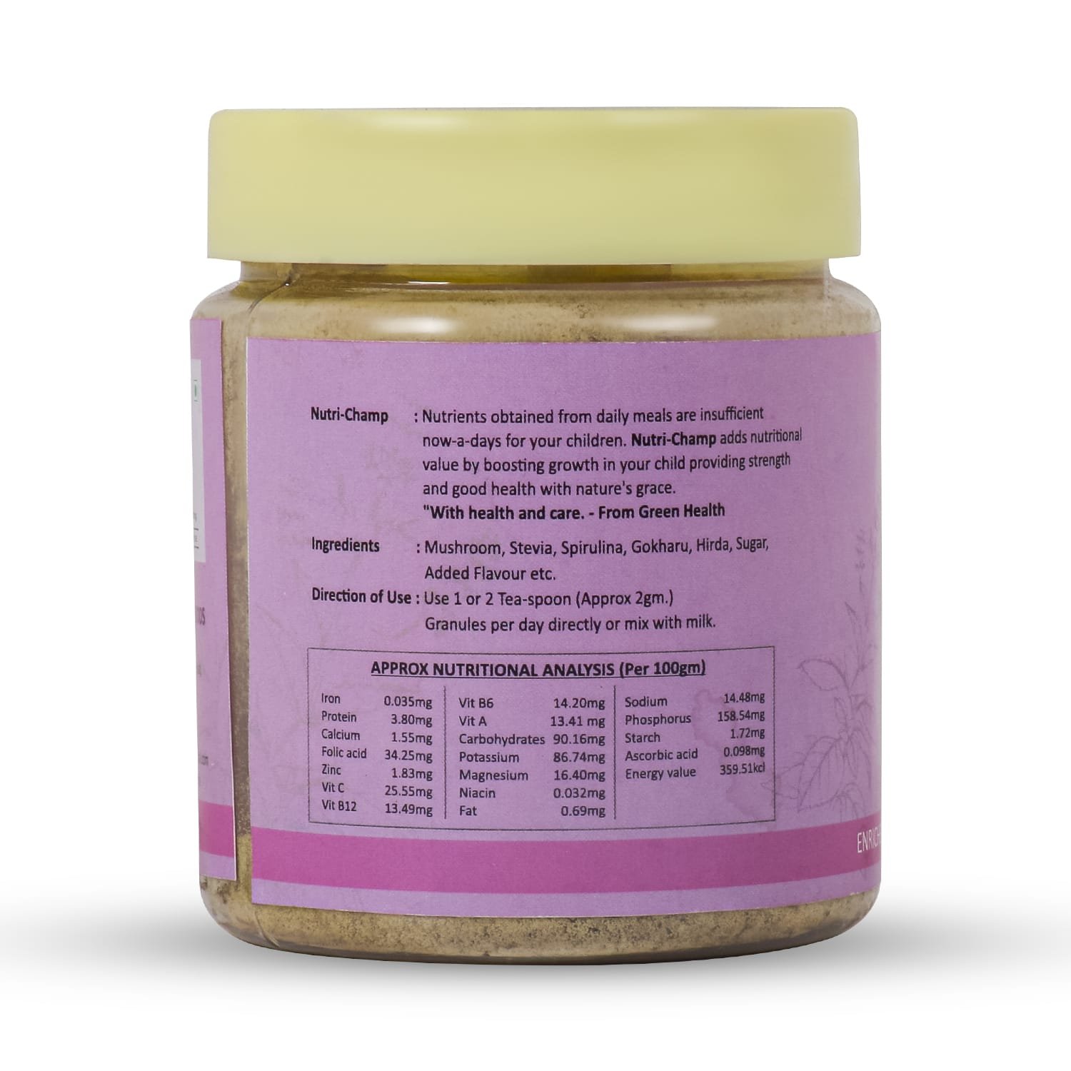 Nutrients obtained from daily meals are insufficient nowadays for your children. Chocolate Flavour Nutri-Champ adds nutrition value by boosting growth in your child providing strength and good health with nature’s grace. “With health and care. – From Green Health