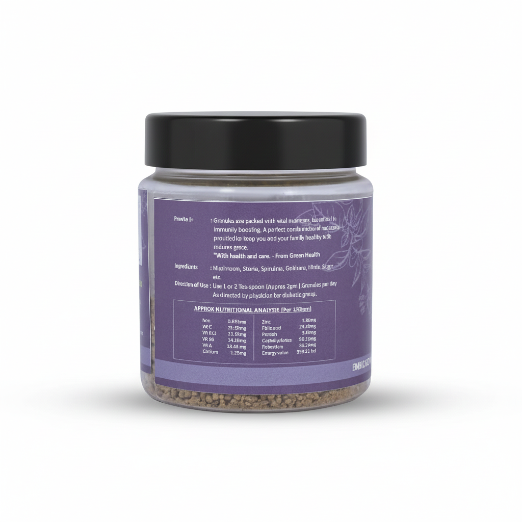 Granules are packed with vital nutrients, beneficial in immunity boosting. A perfect combination of nutrients provided to keep you and your family healthy with nature’s grace “With health and care. – From Green Health